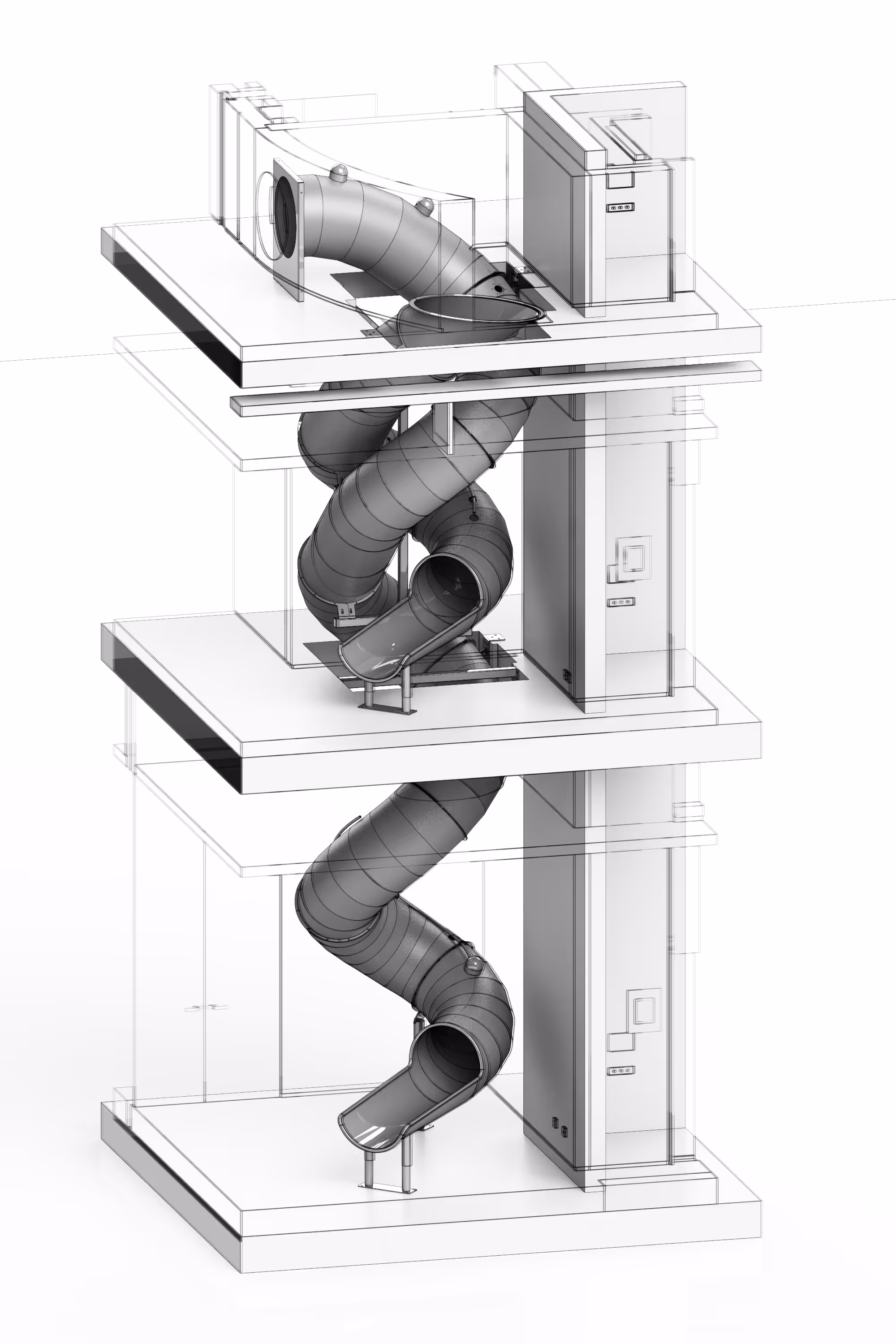 At the heart of the award-winning IO House in North London, designed by KSR Architects, are two bespoke spiralling stainless steel tunnel slides. Accessed via a motion-activated iris portal, the slides provide a thrilling descent from the main living areas to the subterranean leisure level. The slides are integrated with smart technology, triggering light and sound effects as they are used, embodying the home's theme. The installation posed unique challenges due to the confined space and the need to accommodate integrated housing for speakers and lighting. Despite these complexities, the slides were seamlessly incorporated, adding a dynamic and playful element that enhances the home's innovative design.