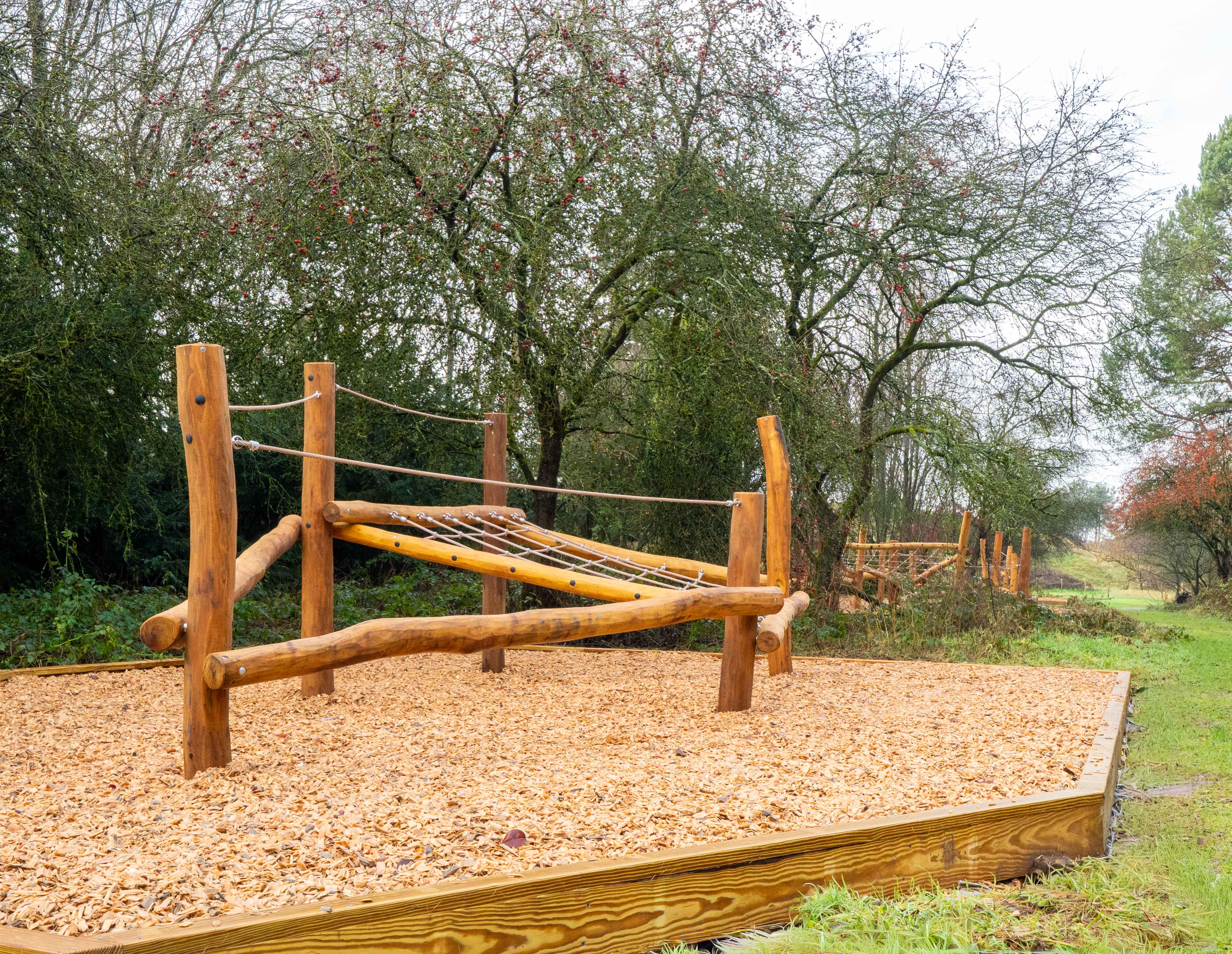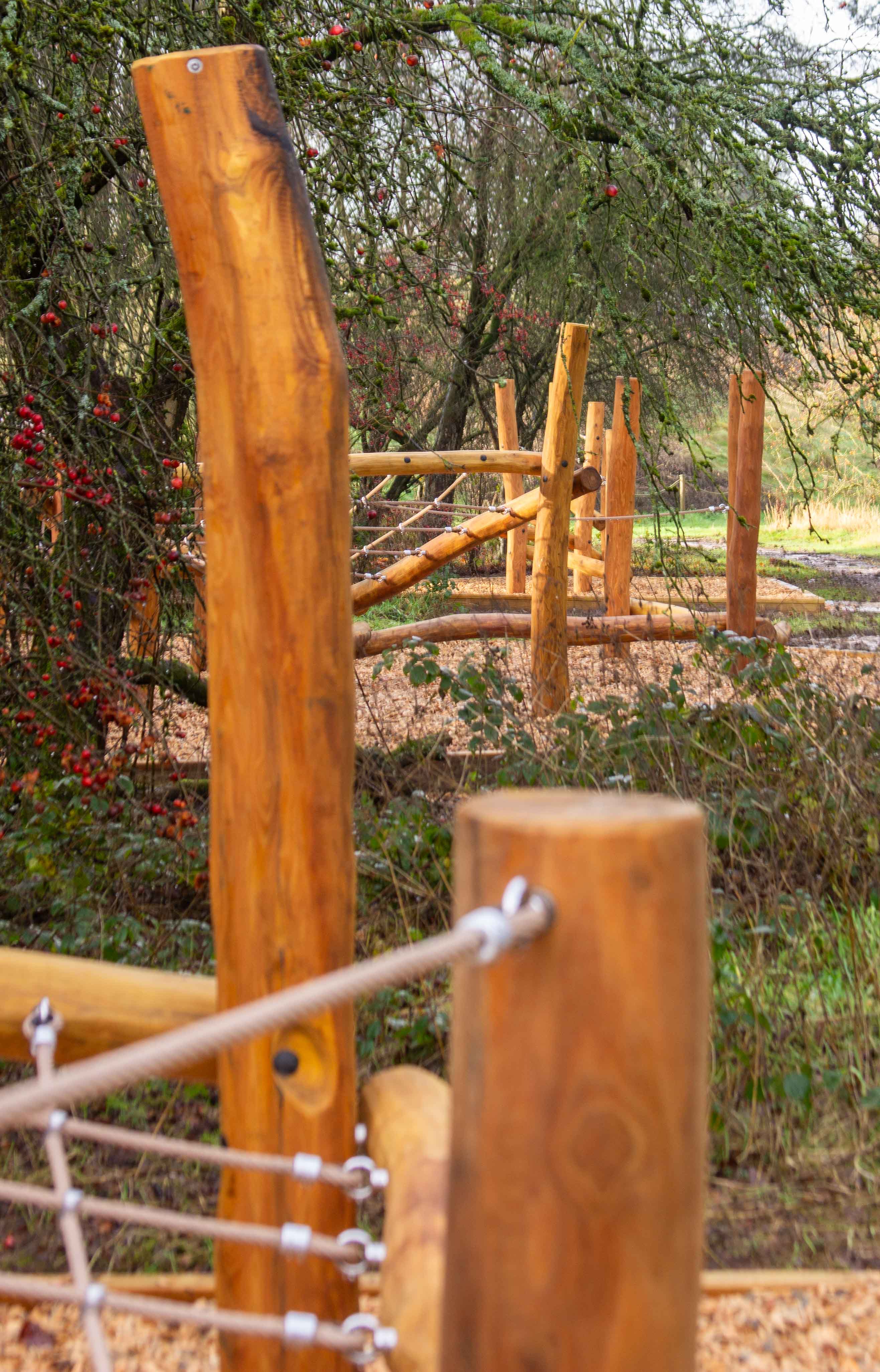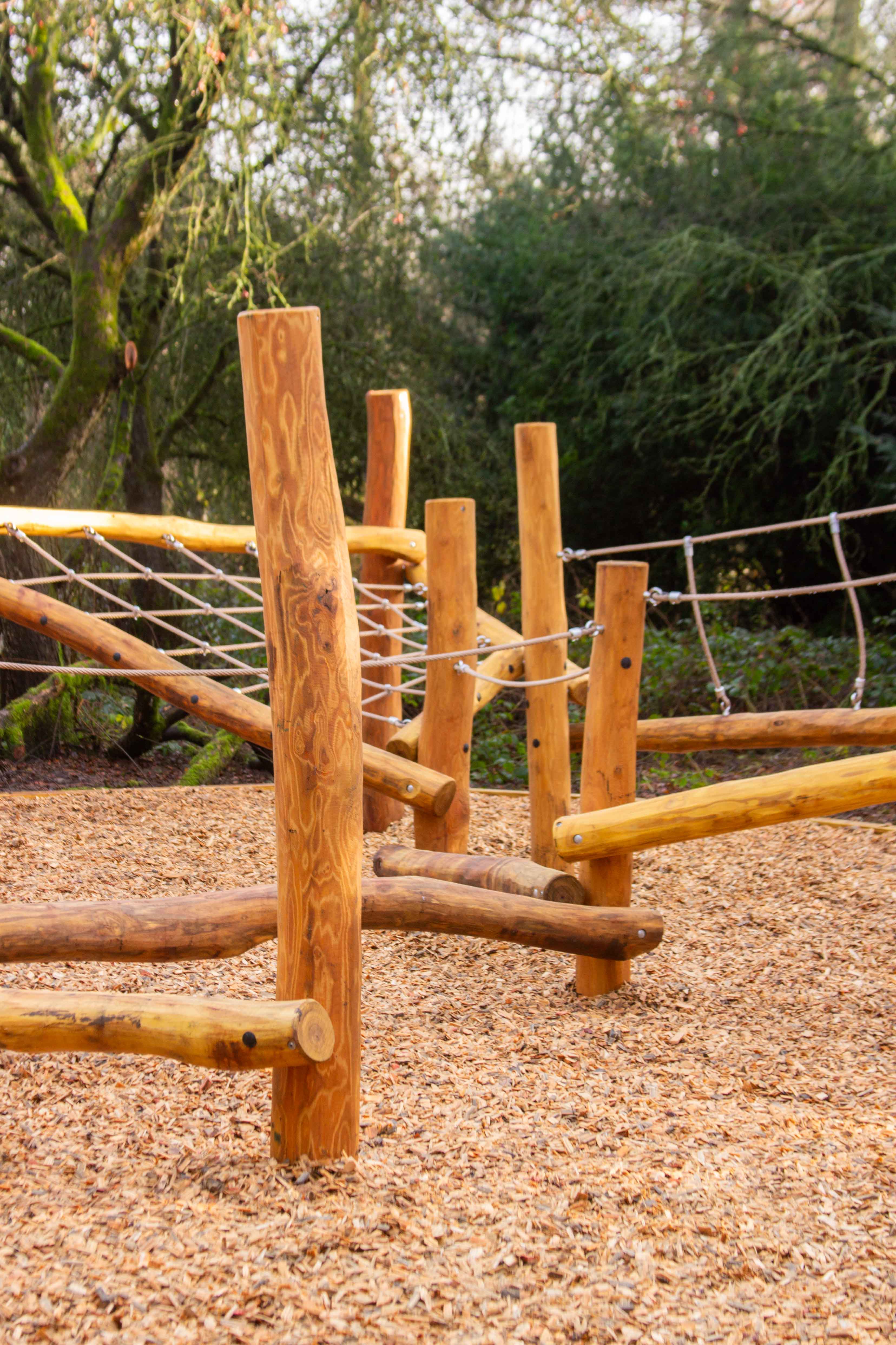 The playground features balancing logs, rope nets and climbing and scrambling elements at varying heights and levels of challenge. Crafted from irregular Robinia timber, each structure offers a tactile, natural play experience that encourages movement, confidence and curiosity.