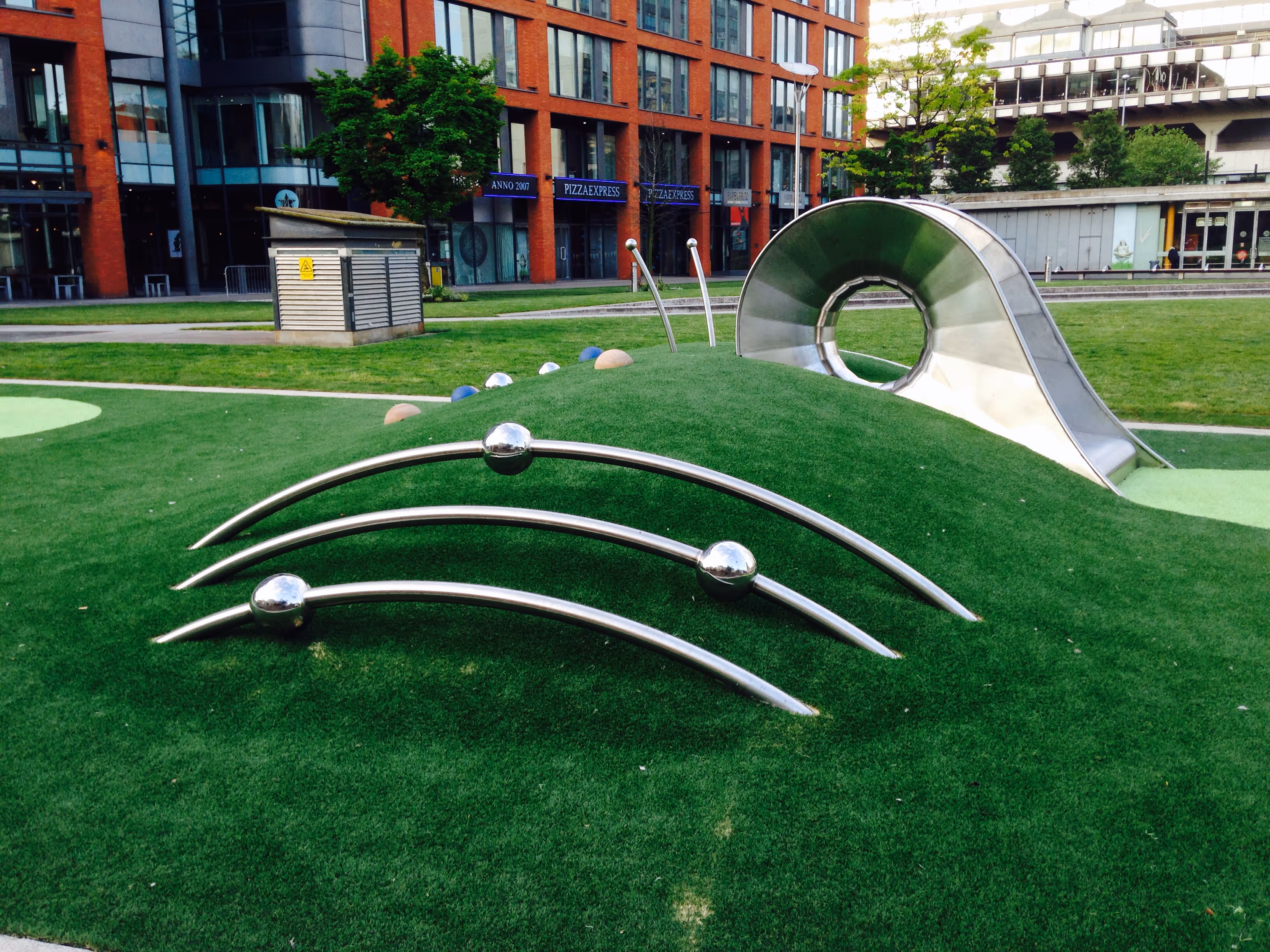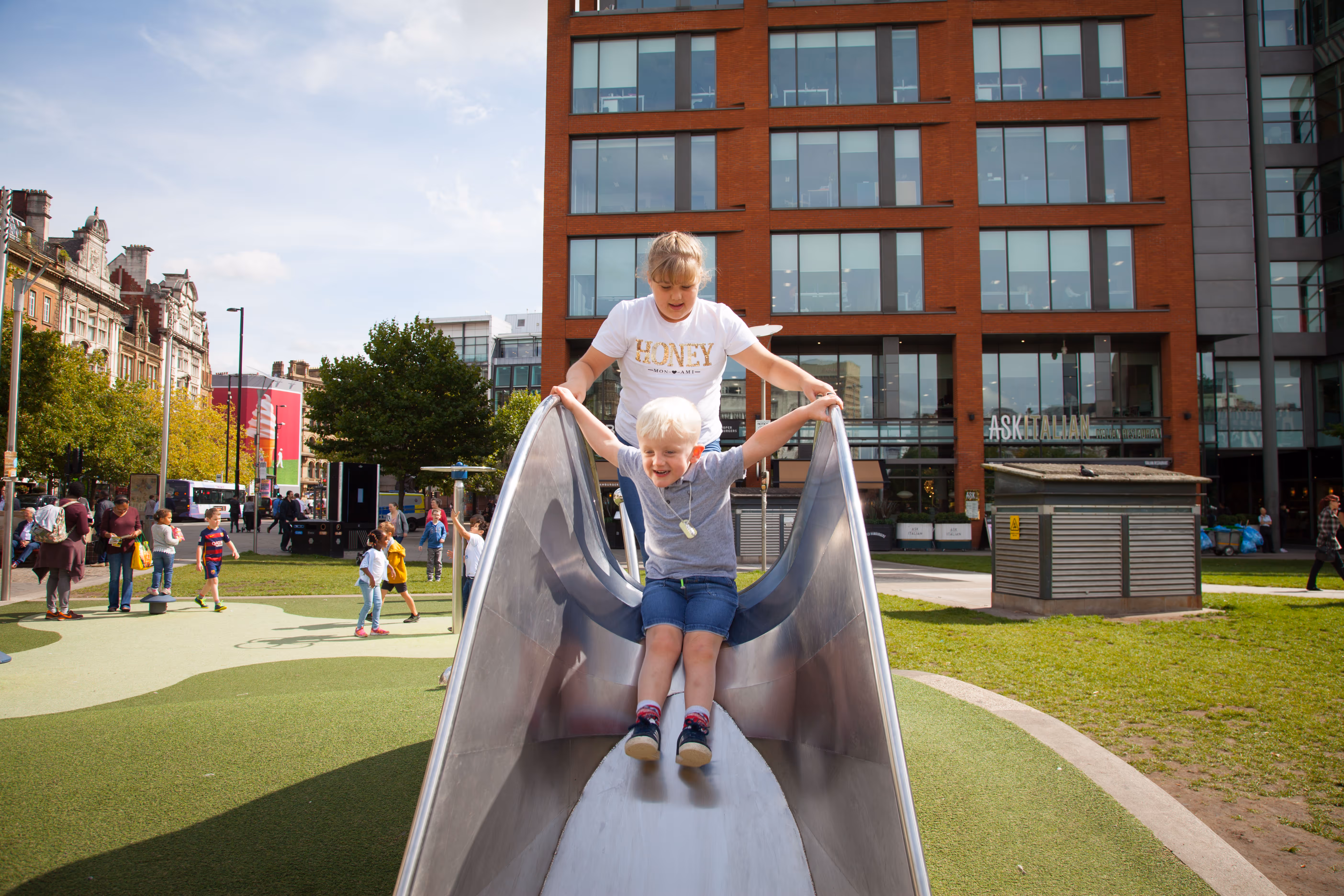 Right in the centre of Manchester, Piccadilly Gardens is one of the city’s busiest public spaces, so when commissioned to design a play area here, we knew it had to be both fun and functional. At the heart of the scheme is “Dilly the Snail,” a bespoke slide that brings charm and instant appeal. The surrounding play equipment includes reed spinners, balance rails, and tulip spinners, all designed to engage a wide age range with durable materials suited to a busy urban environment, while maintaining a playful and inviting atmosphere.