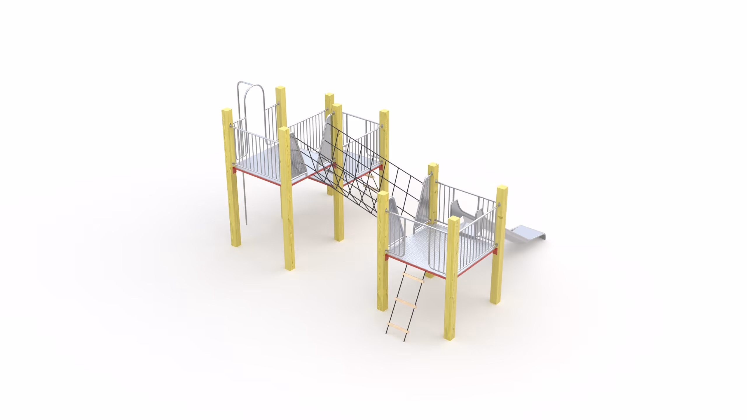 Thrill-seekers of all ages will find excitement in our carefully crafted play units. The 3 Tower Lamba Play Unit is aimed at the younger age range, but starts to bring in some more challenging play elements with the addition of an additional deck. The fireman’s pole and the bannister rails give a more rewarding experience to children after they’ve climbed up to the higher decks. Whilst being compact in size, it packs a lot in play value and performance.